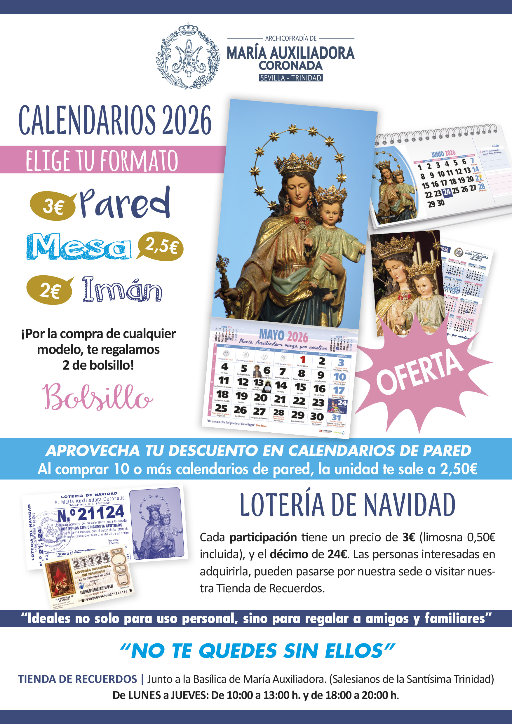 Los calendarios y la lotería pueden adquirirse en la Tienda de Recuerdos ubicada en junto a la Basílica de María Auxiliadora, con un horario de atención de lunes a jueves, de 10:00 a 13:00 h. y de 18:00 a 20:00 h. Próximamente también se podrán adquirir en las diferentes eucaristías dominicales.