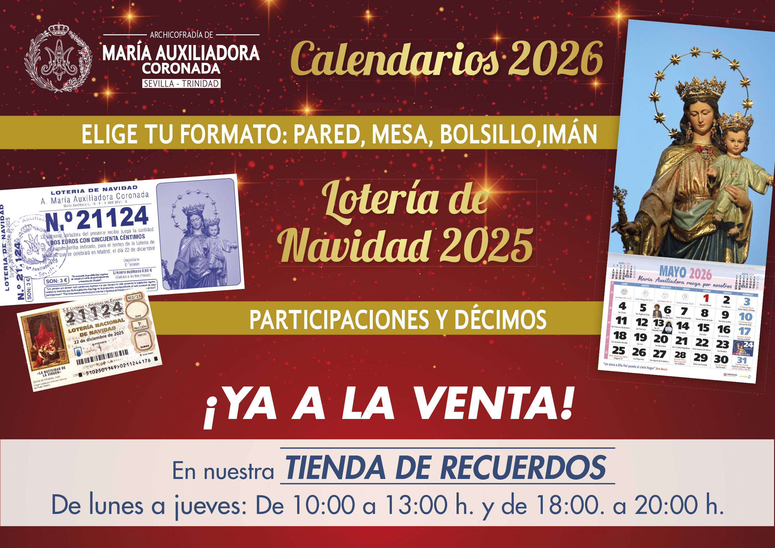 Los calendarios y la lotería pueden adquirirse en la Tienda de Recuerdos ubicada en junto a la Basílica de María Auxiliadora, con un horario de atención de lunes a jueves, de 10:00 a 13:00 h. y de 18:00 a 20:00 h. Próximamente también se podrán adquirir en las diferentes eucaristías dominicales.